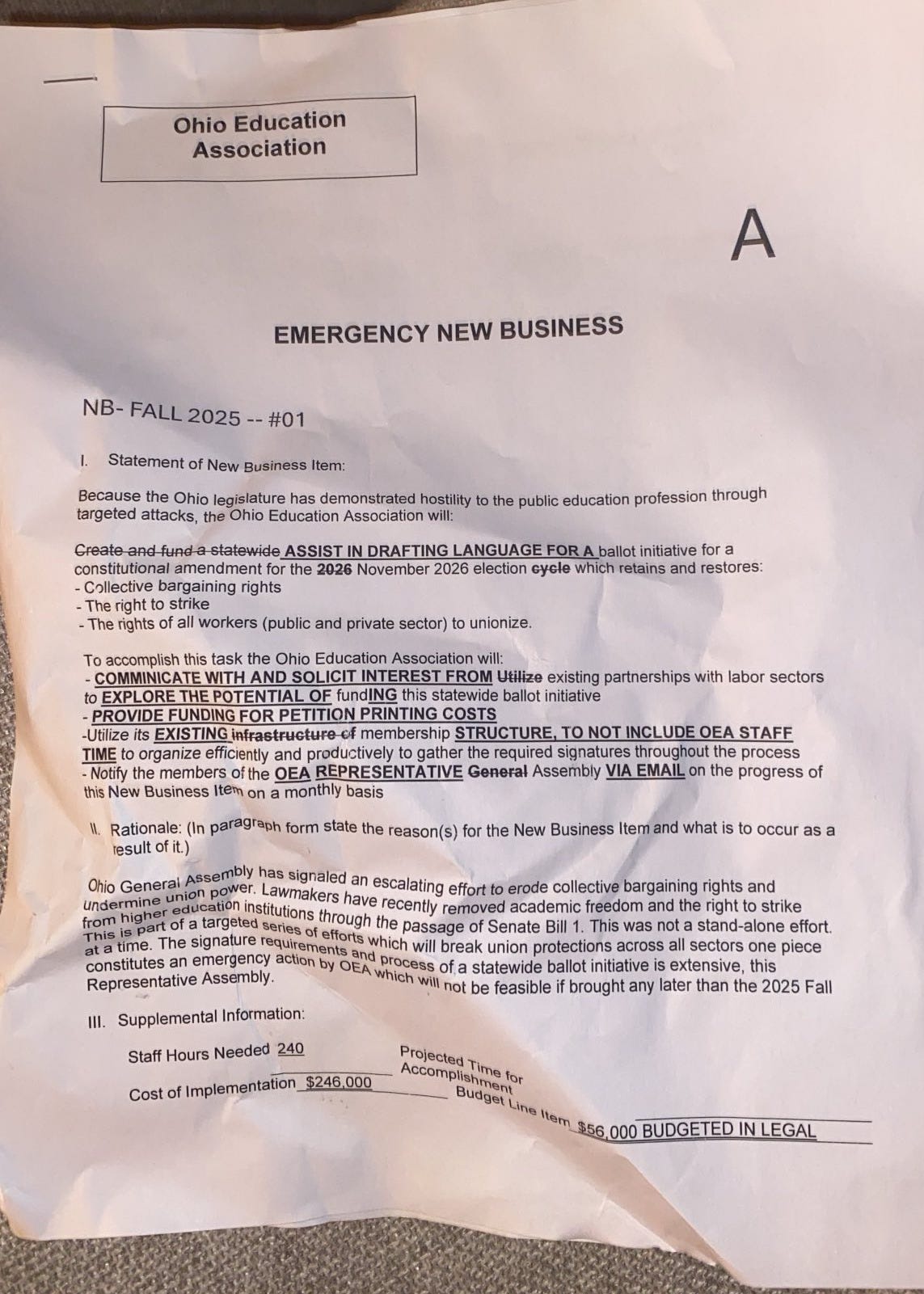 Ultimately the motion was amended and passed as an effort in which OEA will gauge interest in and explore the feasibility of protecting collective bargaining rights and bring forward something to the OEA general assembly at the spring 2028 RA. Leadership left the process and timeline for doing so intentionally vague.